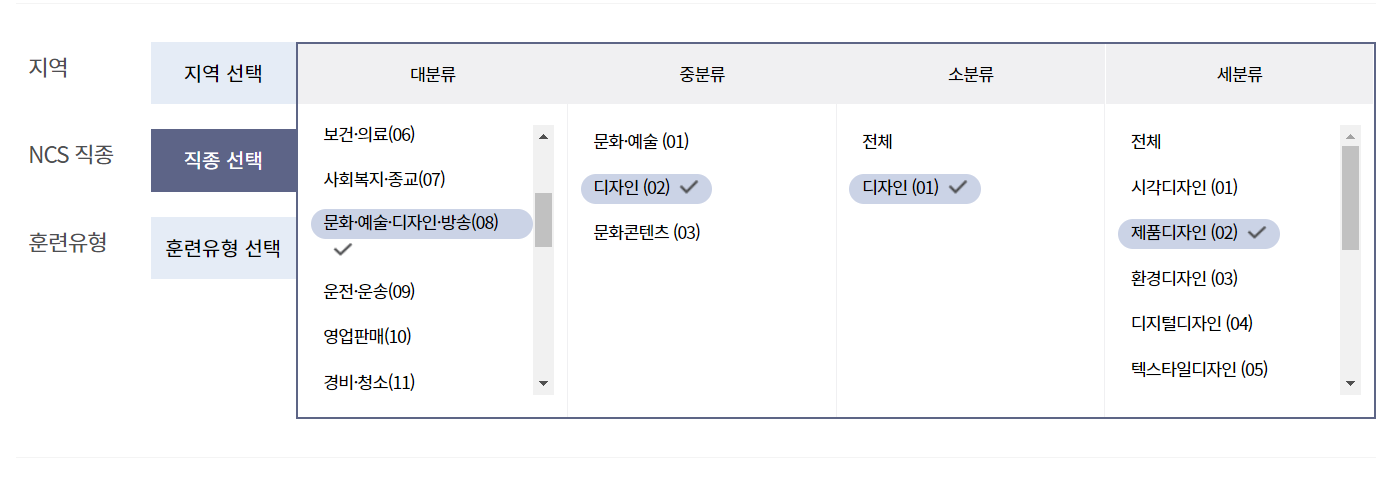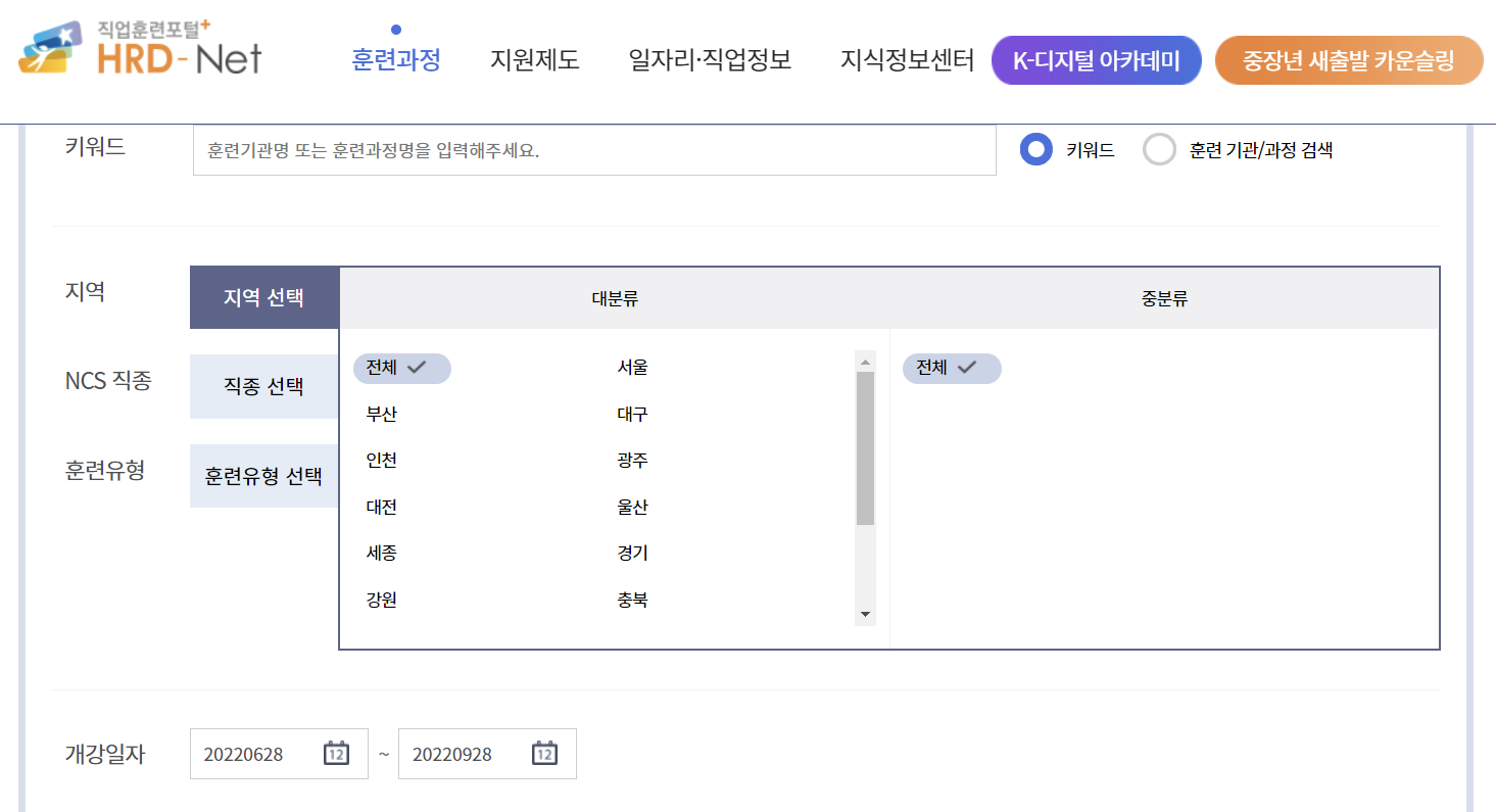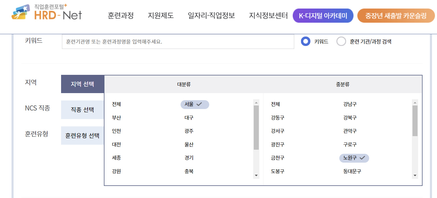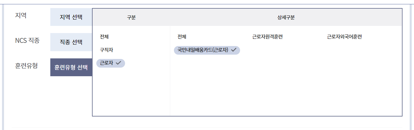 3. 지역, 직종, 훈련유형을 선택합니다.