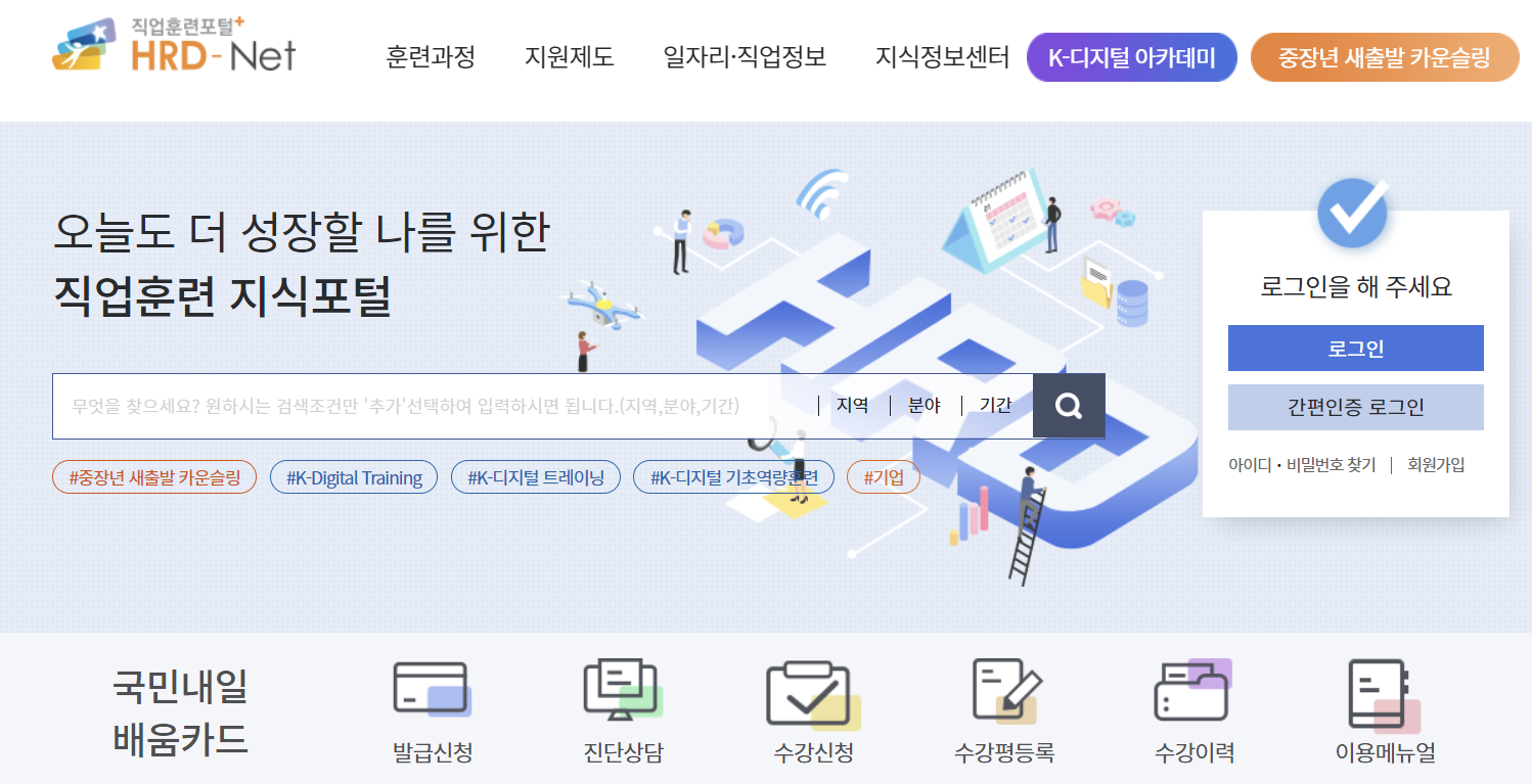 국민 내일 배움 카드는 급격한 기술발전에 적응하고 노동시장 변화에 대응하는 사회안전망 차원에서 생애에 걸친 역량개발 향상 등을 위해 국민 스스로 직업 능력 개발훈련을 실시할 수 있도록 훈련비 등을 지원하는 서비스입니다. 급격하게 기술이 발전되면서 직업도 다양해지고 예전에 배웠던 나의 기술만으로는 빠르게 변화하는 시대에 맞춰가기는 어렵기는 합니다. 예전에는 아날로그 방식의 일이 대부분이었다면 지금은 대부분이 디지털 방식으로 운영이 되어가고 있고 한 가지 직업으로 평생을 살기는 어려워진 세상인 듯합니다.