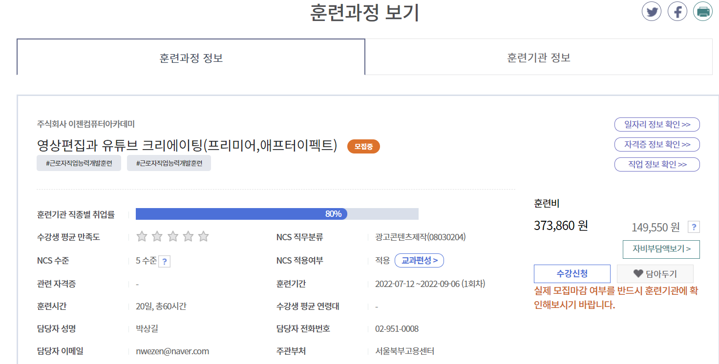 ▶ 그럼 이렇게 내가 선택한 분야에 대한 정보가 제공되고 총 훈련비와 지원받을 금액, 자비부담액 등을 알아볼 수 있답니다.