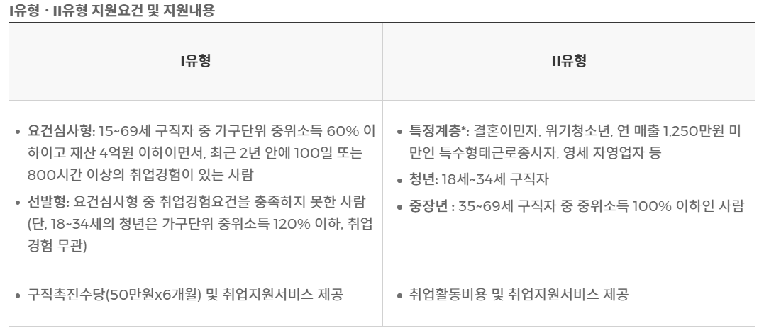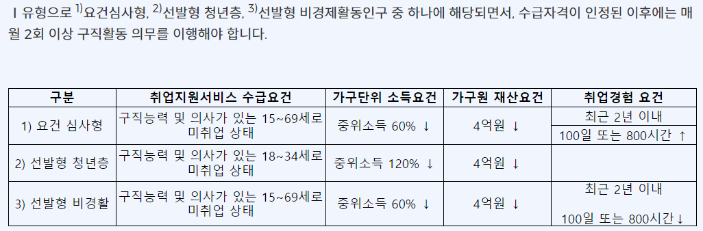 ① 여건심사형 : 15~69세 구직자 중 가구단위 중위소득 60% 이하, 재산 4억 원 이하이며 최근 2년 안에 100일 또는 800시간 이상의 취업경험이 있는 사람