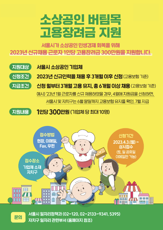 정부에서 어려운 소상공인을 위한 지원 사업으로 소상공인 버팀목 고용장려금 사업을 진행하고 있습니다. 해당 소상공인은 신규인력 채용 후 3개월 후 신청할 수 있는데 1인당 300만 원을 지원받을 수 있습니다. 신청기간은 예산 소진 시까지이므로 예산 소진 전에 신청하여 지원받으시길 바랍니다. 지금은 어려운 시기지만 정부에서 운영하는 소상공인 지원사업으로 도움을 받아 힘든 시기를 잘 극복할 수 있는 계기가 되었으면 합니다. 소상공인 버팀목 고용안정장려금의 경우 온라인 접수가 되지 않기 때문에 서류를 작성하여 기업체 소재 자치구로 방문을 하거나 e-mail이나 팩스를 통해 접수 가능합니다.
