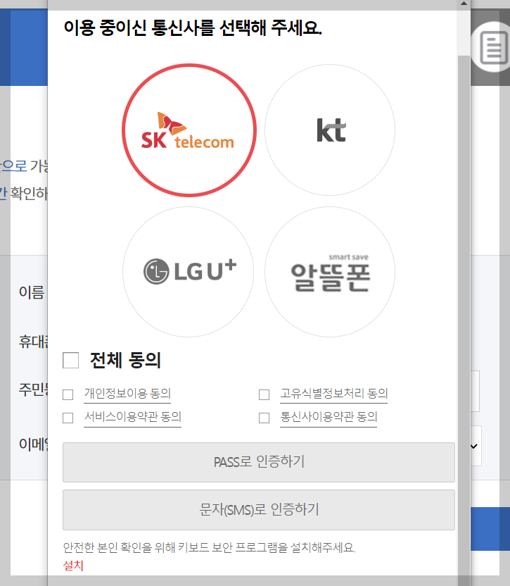4) 이름, 휴대폰 번호, 주민등록번호, 이메일을 기재하고 하단에 본인이 가능한 인증을 합니다.