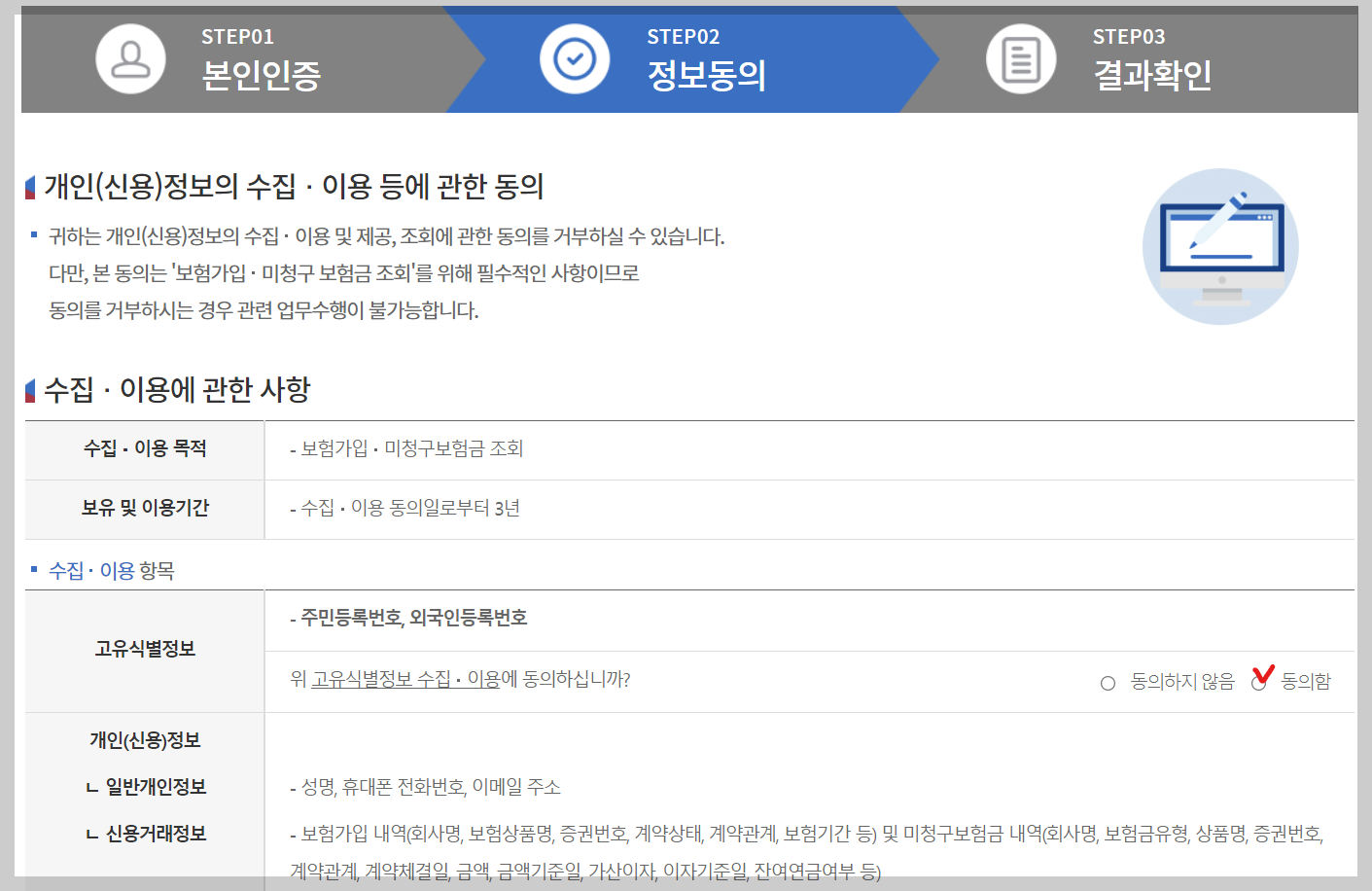 이렇게 동의를 체크하면 나의 숨은 보험금을 조회할 수 있답니다.