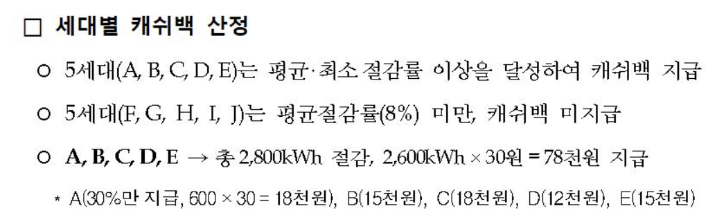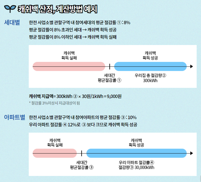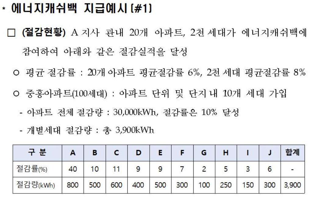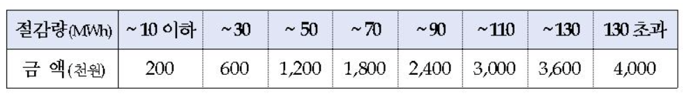 - 아파트 : 아파트 절감량(아파트 내 개별세대가 캐시백을 지원받은 절감량 제외) 기준 구간별 정액 지급
