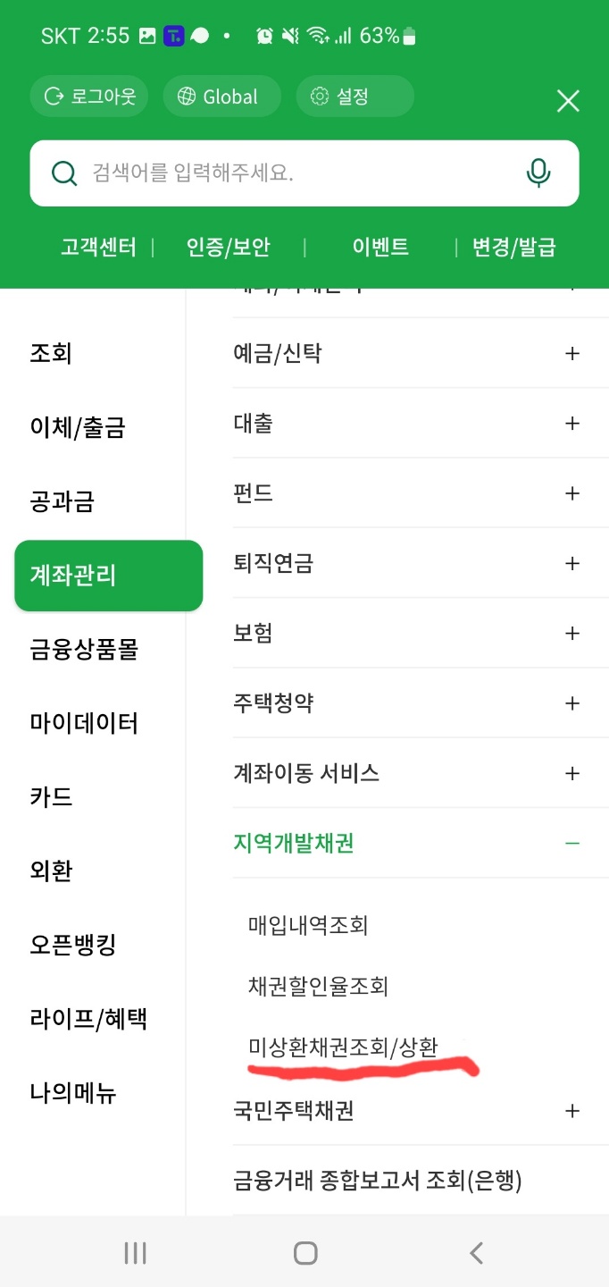 3) 지역개발채권에 미상환 채권 조회/상환을 클릭합니다.