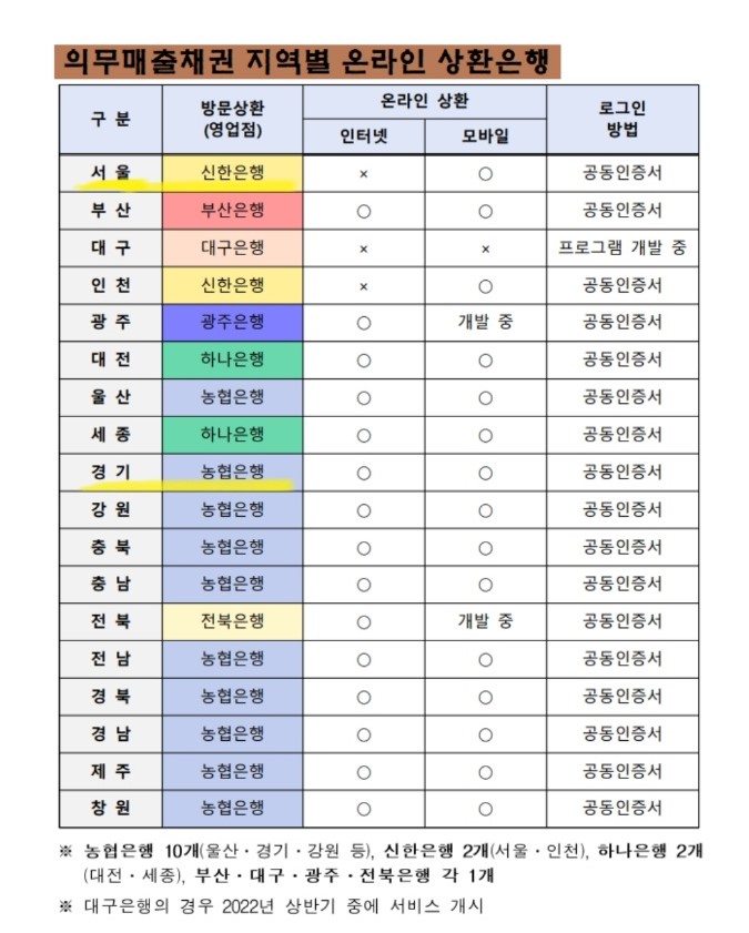 ※ 지금 보이는 표에는 지역별 매출채권에 대한 온라인 상환 은행이 나와있습니다.