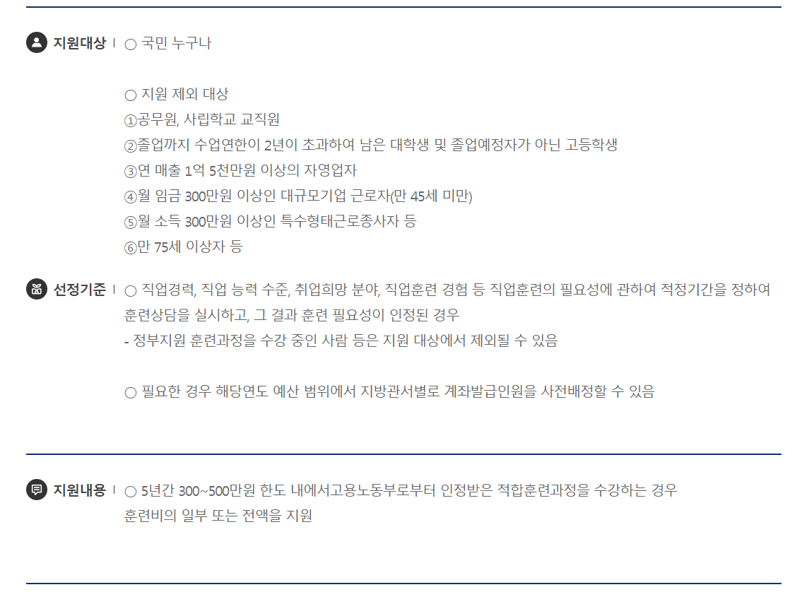 ☞ 나온 혜택들 중에 예를 들어 국민 내일 배움 카드를 클릭해보겠습니다.