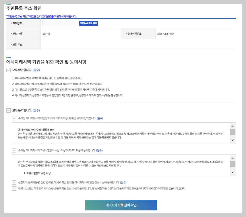 ▶ 주민등록 주소 확인을 클릭해서 주민번호를 입력하면 고객번호가 나옵니다 . 고객번호를 선택합니다. 그리고 캐시백 가입을 위한 동의를 하고 에너지캐시백 참여확인을 클릭합니다.