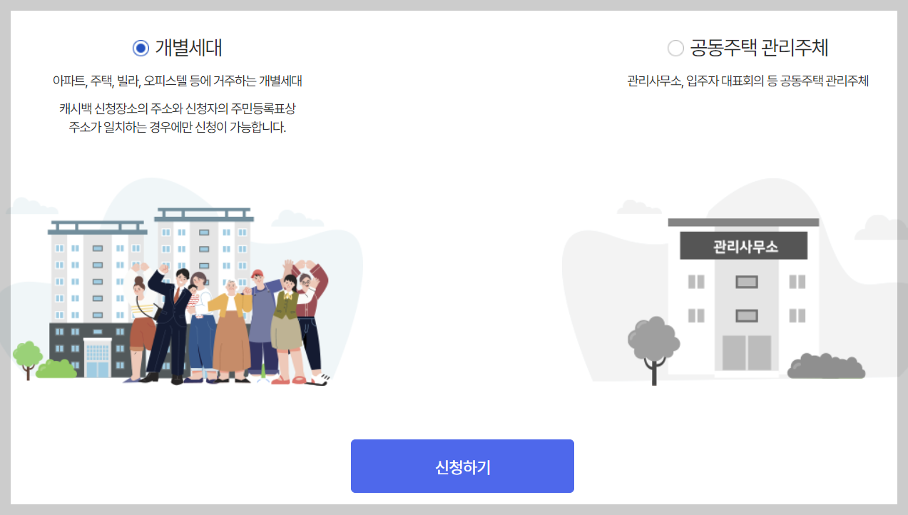 ▶ 개별세대인지 공동주택 관리주체인지 선택하여 신청하기 버튼을 누릅니다.