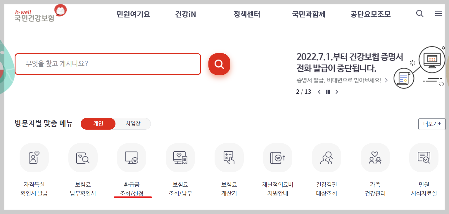 국민건강보험 홈페이지→환급금 조회/신청을 통해서도 확인 가능