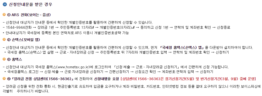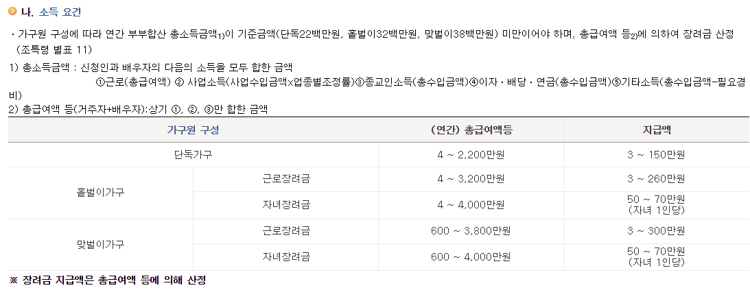 - 현재 근로소득, 사업소득, 종교소득이 있는 단독가구, 홑벌이 가구, 맞벌이 가구가 장려금 신청 대상입니다.